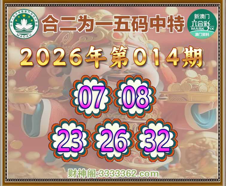 014期:【合二为一】 🚵‍♀️五码中特🚵‍♀️【07.08.23.26.32】开:26