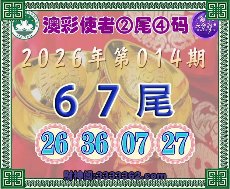 014期:【澳彩使者】 ☺️②尾④码☺️【67尾主:26.36.07.27】开:26